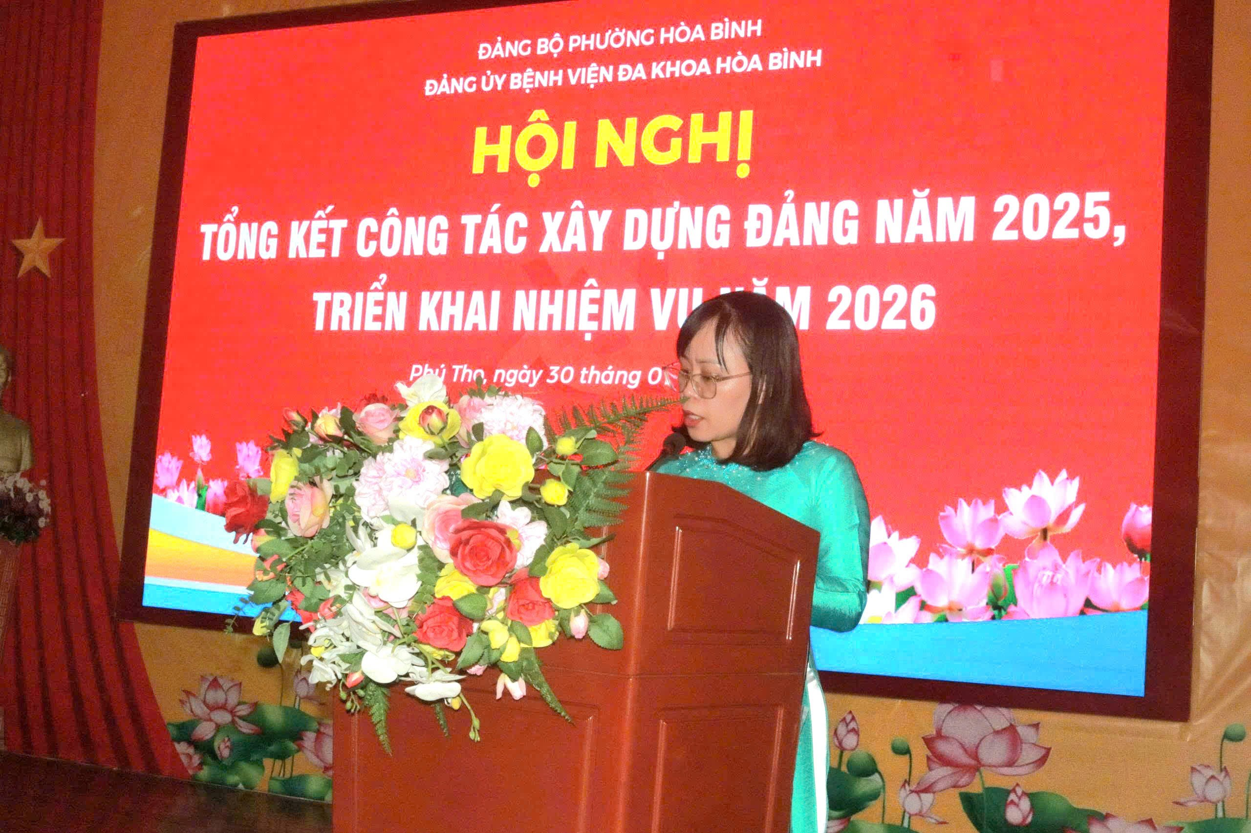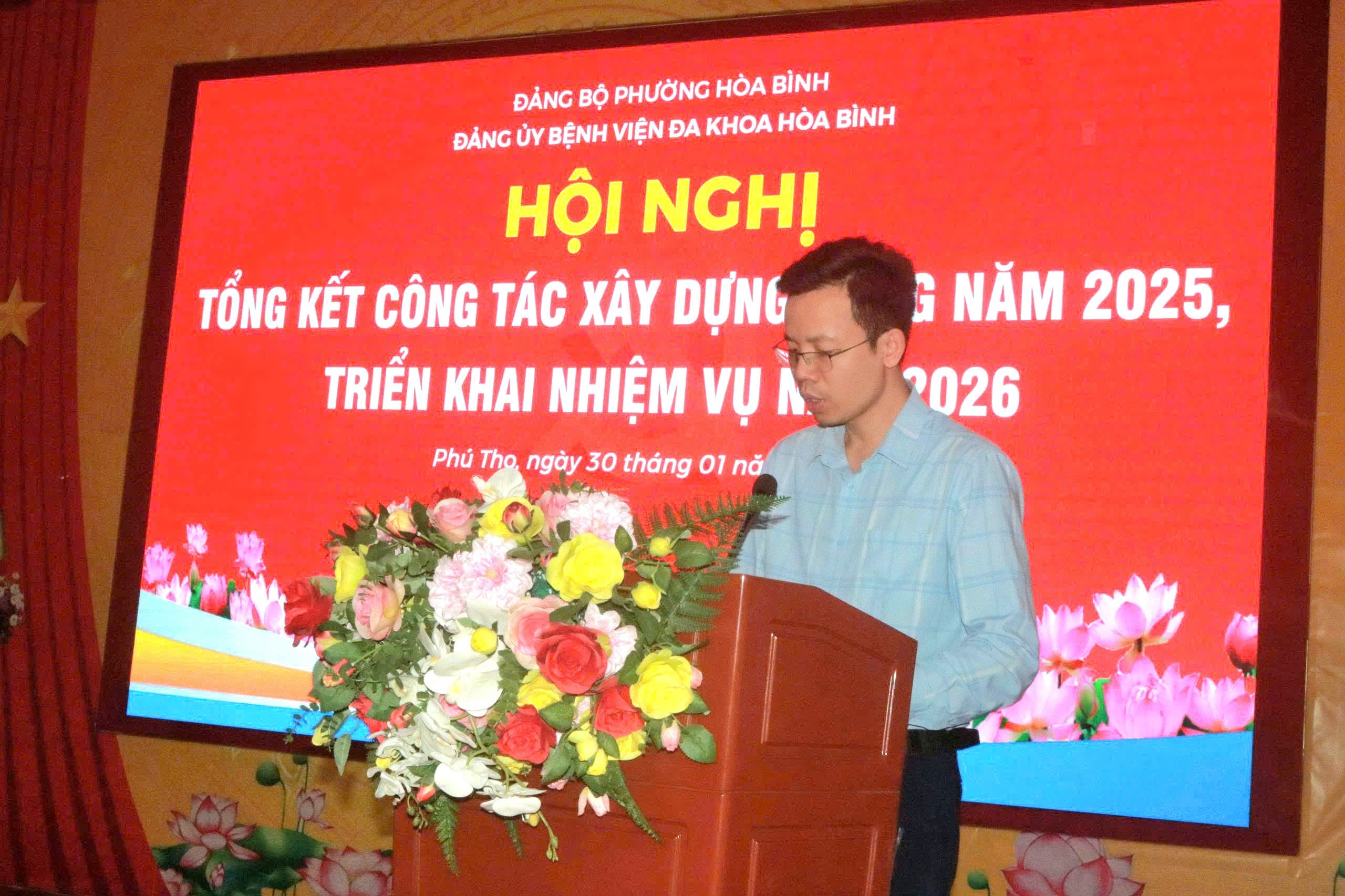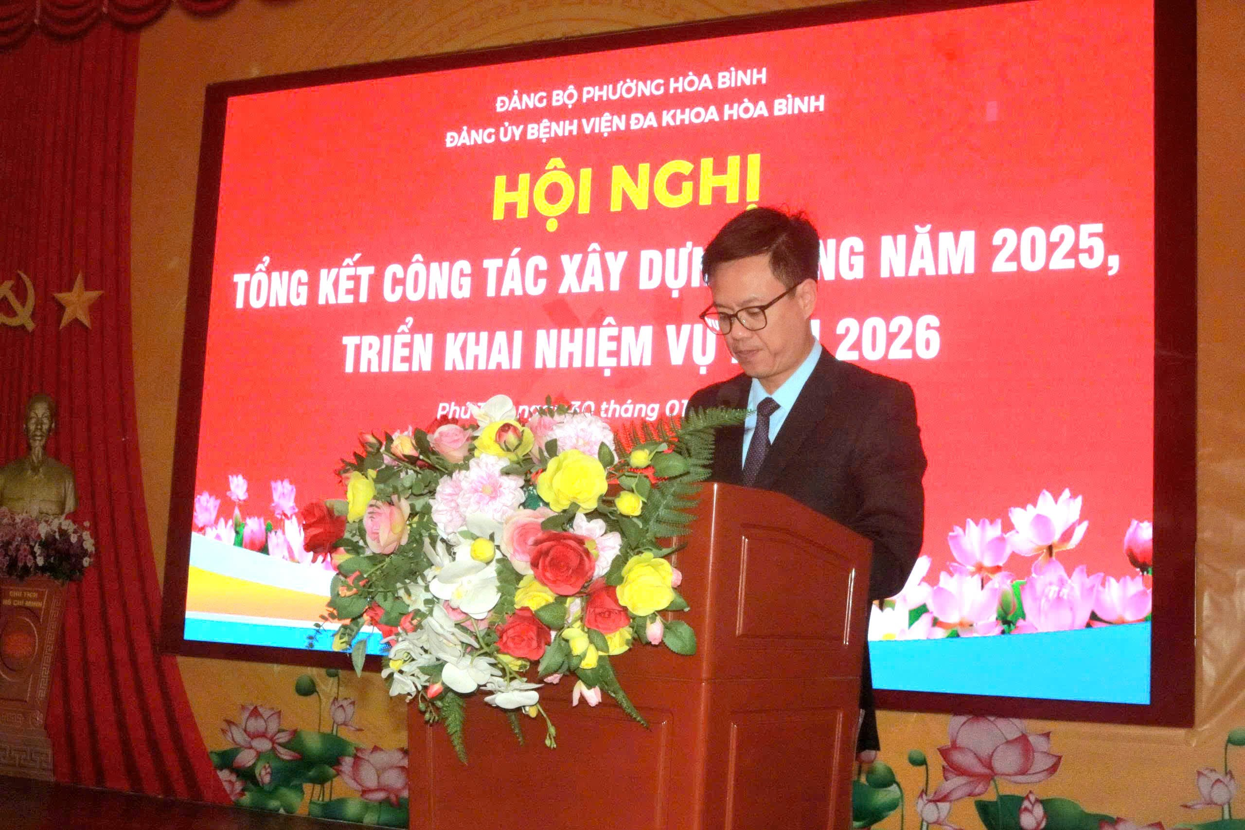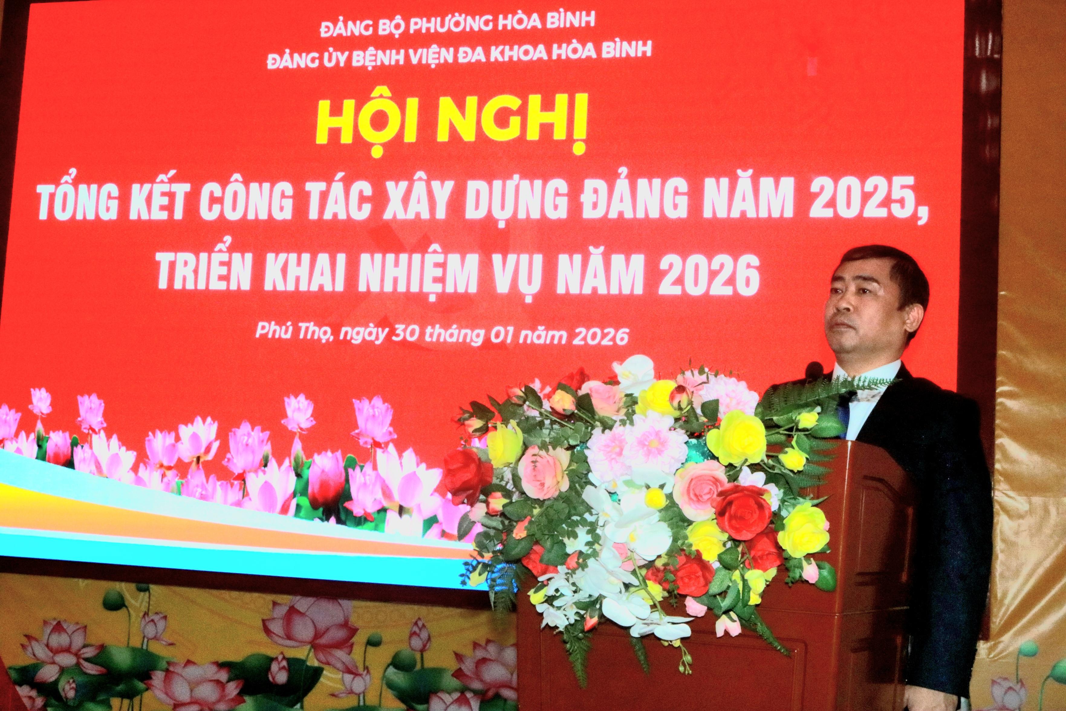 Chiều 30/01, Đảng bộ Bệnh viện Đa khoa Hòa Bình long trọng tổ chức Hội nghị Tổng kết công tác xây dựng Đảng năm 2025, triển khai nhiệm vụ năm 2026. Dự và chỉ đạo Hội nghị có đồng chí Nguyễn Hữu Luyện, Phó Bí thư Đảng ủy, Chủ tịch UBND phường Hòa Bình. Tham dự còn có Nguyễn Thị Sang, Ủy viên BCH Đảng bộ, Phó Trưởng Ban xây dựng Đảng, Đảng ủy phường Hòa Bình; TS.BS Nguyễn Hoàng Diệu, Bí Thư Đảng ủy, Giám đốc Bệnh viện, các đồng chí trong Ban chấp hành Đảng ủy, lãnh đạo các chi bộ Đảng và Đảng viên đại diện cho 300 Đảng viên trong toàn Đảng bộ.