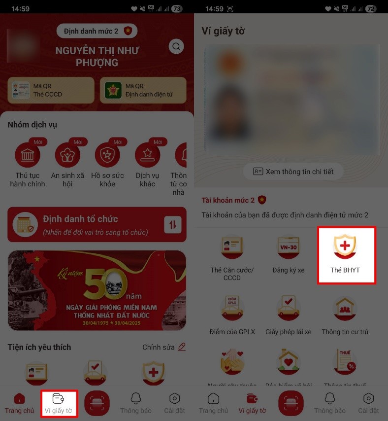 Nhấn chọn vào mục Ví giấy tờ > Tiếp tục chọn vào mục Thẻ BHYT để tiến hành tích hợp.