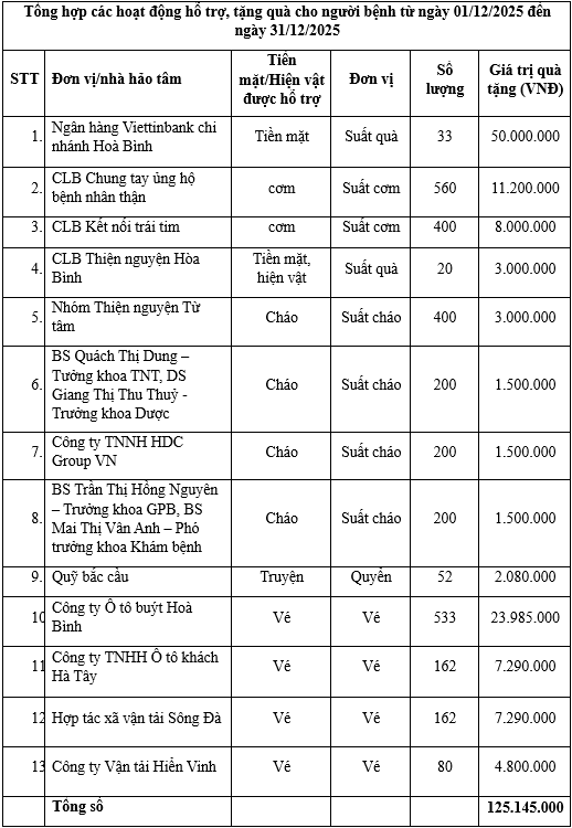 Đặc biệt, Bệnh viện ghi nhận sự đồng hành quý báu của các đơn vị vận tải trên địa bàn tỉnh gồm: Công ty Ô tô buýt Hòa Bình, Công ty TNHH Ô tô khách Hà Tây, Hợp tác xã vận tải Sông Đà và Công ty Vận tải Hiển Vinh, đã hỗ trợ 937 vé xe buýt miễn phí mỗi tháng cho bệnh nhân chạy thận nhân tạo, với tổng giá trị hỗ trợ 42.165.000 đồng/tháng. Đây là sự hỗ trợ thiết thực, góp phần giảm gánh nặng chi phí đi lại cho người bệnh điều trị dài ngày.